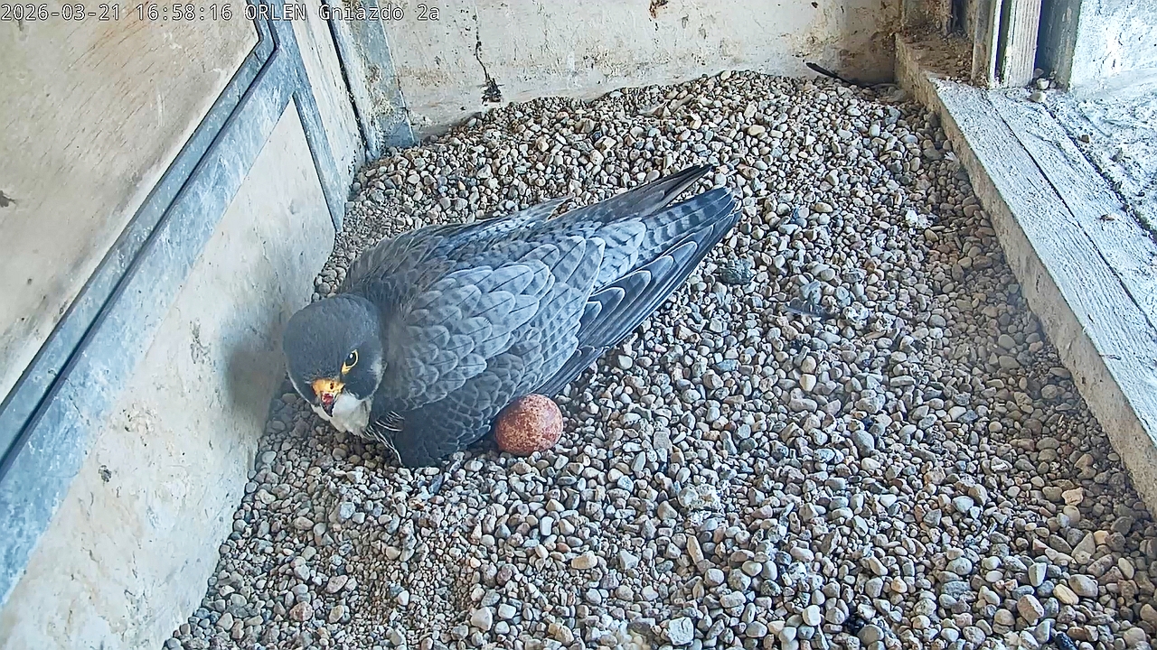 Po przynajmniej godzinie zostawienia jajek samych Werwa wróciła do budki, zaraz dostała obiad od Rafika, odleciała z nim, wróciła i teraz drze dzioba na podeście :P Rafik siedzi na jajkach i nie ma na razie zamiaru schodzić
